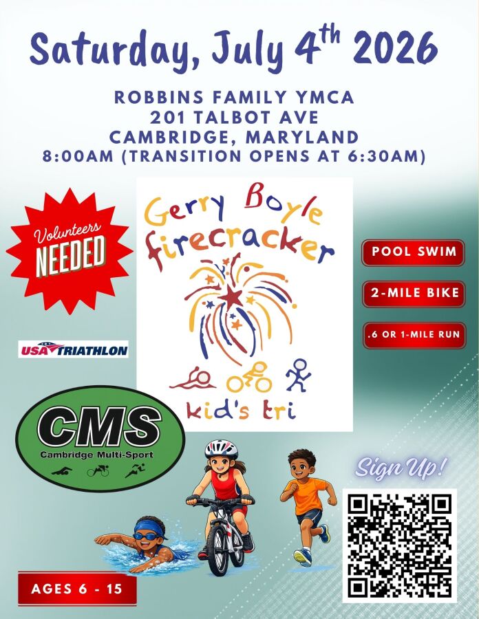 Come take part in a Cambridge tradition, the 2026 Firecracker Kids Triathlon will be held on Saturday, July 4, 2026 at the Robbins Family YMCA (201 Talbot Avenue, Cambridge, MD 21613). This annual event starts at 8am and includes athletes in the 6-7 year old, 8-9 year old, 10-11 year old, 12-13 year old and 14-15 age groups. With a 25 yard (6-7 yoa), 50 yard (8-9 yoa), 100 yard (10-11 yoa), 150 yard (12-13 yoa) and 200 yard (14-15 yoa) pool swim where flotation devices are allowed.