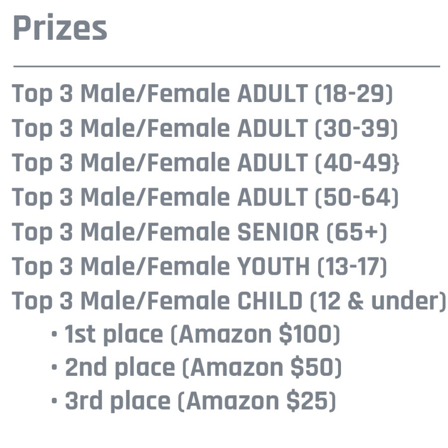 Top 3 Male/Female in each age category will receive an Amazon Gift Card and a trophy.