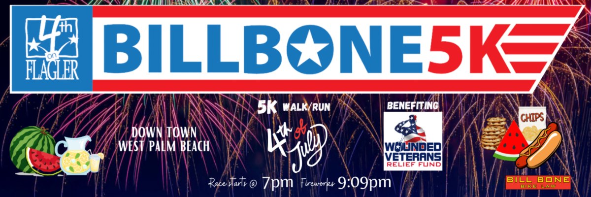 The 6th Annual Bill Bone 5K is an Evening Race on July 4th starting at 7:00pm. The Race raises money for the Wounded Veterans Relief Fund and is known as a “Run to the Fun” because it finishes in Downtown West Palm Beach as part of the 4th on Flagler Celebration festivities.