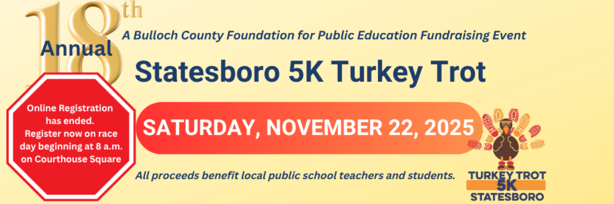 The Statesboro 5K Turkey Trot is an annual fundraising event for the Bulloch County Foundation for Public School Education. All proceeds are used to fund the Foundation's innovation grants for teachers, college scholarships for Bulloch County's REACH Georgia Scholars, and support the Bulloch County Teacher of the Year and Bulloch County STAR Student/Teacher programs. Thank you for your participation. Your support truly makes a difference in the lives of teachers and students.