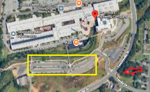 The Participants and spectators may park in the large lot of Revolution Mill off of Yanceyville Street and Textile Drive. There is a walkable bridge that you can take from the parking lot to the start/finish of race under the 3 smoke stacks.