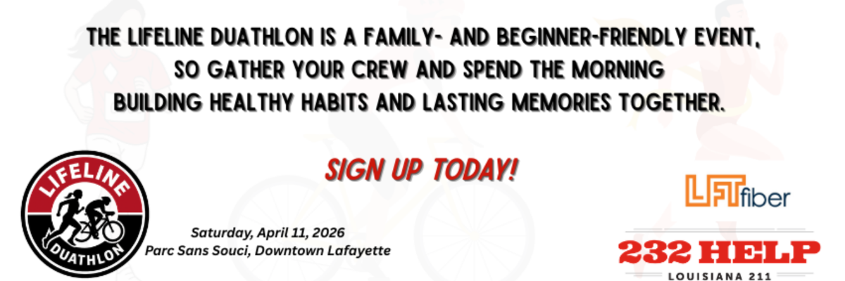 Due to low interest, we are sadly having to cancel the Lifeline Duathlon. Thank you to all who signed up, you will be refunded your entry fees. This race was planned as a fundraiser for 232-Help, a nonprofit that has served Acadiana for 60 years now, and we were hoping for it to be a way to reach a new audience to share the services that we offer to the community. As it came time to start paying all of the vendors, it was evident that we would be losing money on the event. As a small nonprofit, we had to make the tough decision to cancel the event instead.