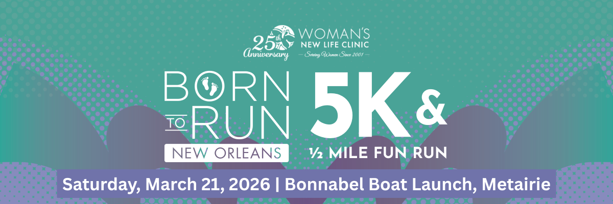 The 2026 Born to Run - New Orleans 5K & 1/2-Mile Fun Run is a great opportunity for runners, walkers, and strollers alike to get involved with Woman’s New Life Clinic (WNLC).