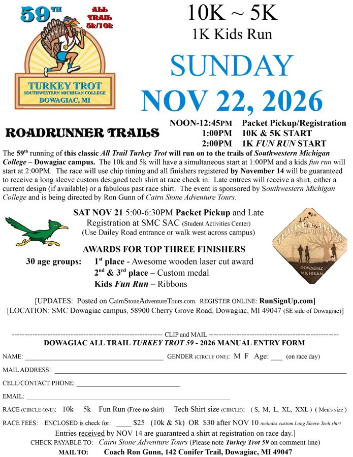 The 59th running of this classic All Trail Turkey Trot will return to the trails of Southwestern Michigan College – Dowagiac campus. The 10k and 5k will have a simultaneous start at 1:00PM and a kids fun run will start at 2:00PM. The race will use chip timing and all finishers who registered by November 8th will receive a long sleeve custom designed tech shirt at race check in. Late entries will get a shirt, either a current year's design or a previous year's design. The event is sponsored by Southwestern Michigan College and is being directed by Ron Gunn of Cairn Stone Adventure Tours. This is Pure Michigan's oldest Turkey Trot with the same race director.