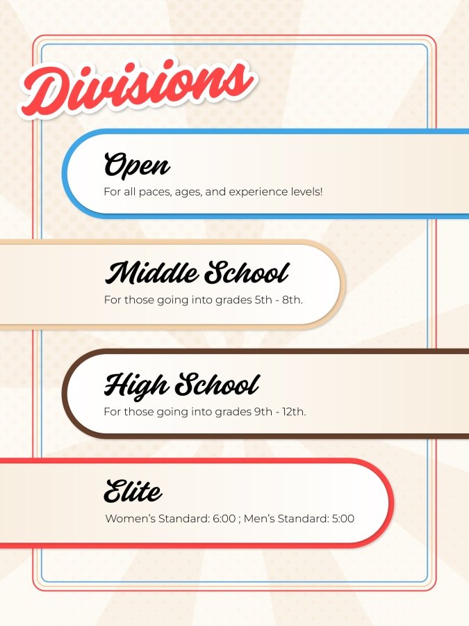 Participants in high school and middle school are encouraged to sign up in their respective divisions, but are warmly welcome to run in the Open Division if they prefer.