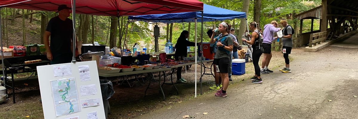 If you are running the 50K race, you will visit the Covered Bridge Aid Station two more times: at approximately mile 21.5 and approximately 25.5.