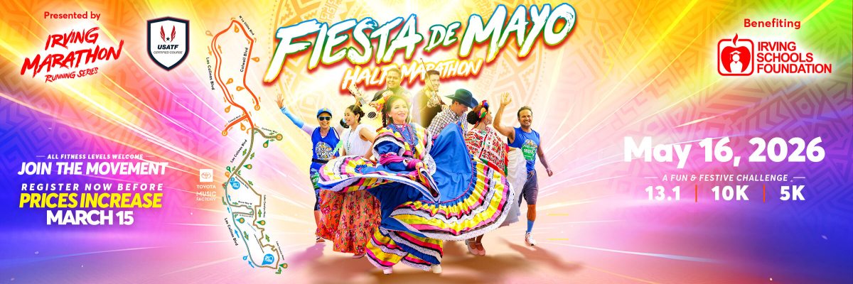 The Fiesta de Mayo Half Marathon gives runners the last chance to get moving through scenic downtown Las Colinas before the Texas summer heat! A distance for everyone! New runners and families are welcome to join the 5K. Experienced runners are likely to choose the 10K while advanced runners compete in the main half marathon event.