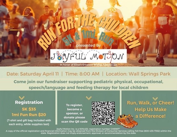 Many of you know that I have been a pediatric physical therapist for my entire 32-year career.  For the past 19 years, I have worked at Joyful Motion Therapy Clinic.  Joyful Motion is a non-profit 501(c)(3) pediatric physical, occupational and speech language/feeding therapy clinic in Palm Harbor Florida. We are hosting our first fundraiser April 11 at Wallsprings Park, and I will be running/walking our first 5k/1k race to help provide these children with top-notch medical care to allow them to overcome their disabilities. Help me support our patients and families by sponsoring me to participate today! Also, would love to see you out there walking/running as well!  Every little bit helps and 100% of funds raised will go directly towards providing much needed therapy for local special-needs children who have no insurance, inadequate insurance for a devastating condition or need assistance with large deductibles!